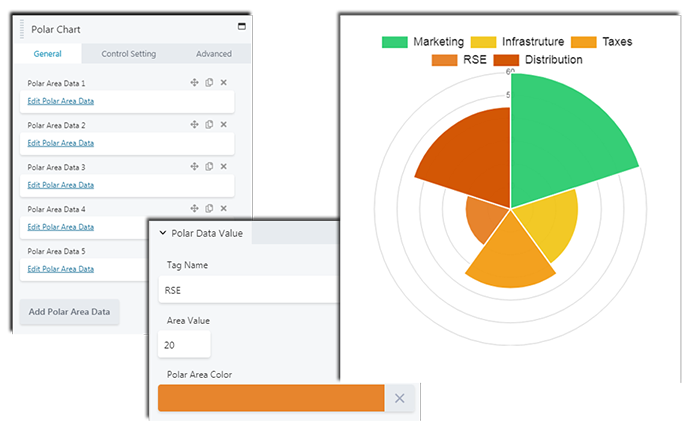 Polar area charts are similar to pie charts, but each segment has the same angle – the radius of the segment differs depending on the value.